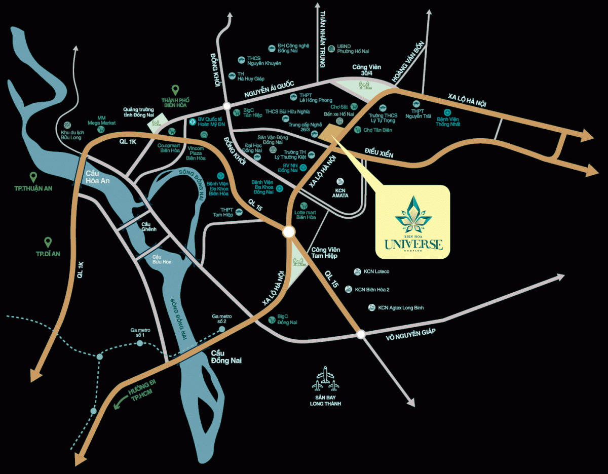 Vị trí Dự án Căn hộ Chung cư Biên Hòa Universe Complex tọa lạc ngay trên Mặt tiền Đường Xa Lộ Hà Nội, Phường Hố Nai, Thành phố Biên Hòa, Tỉnh Đồng Nai,trung tâm sầm uất bậc nhất Đồng Nai. Đồng thời, dự án còn sở hữu vị trí đắt giá khi là tâm điểm kết nối các trục giao thông huyết mạch giữ vai trò quan trọng trong liên kết vùng Trung Bộ, Tây Nguyên với vùng kinh tế trọng điểm phía Nam. Dự án Biên Hòa Universe Complex Hố Nai có vị trí đắc địa bậc nhất Biên Hòa hiện nay, nằm cách trung tâm thành phố Biên Hòa chỉ 5 phút & cách Sân Bay Quốc Tế Long Thành 15 phút thông quan cao tốc TP HCM – Long Thành – Dầu Giây.